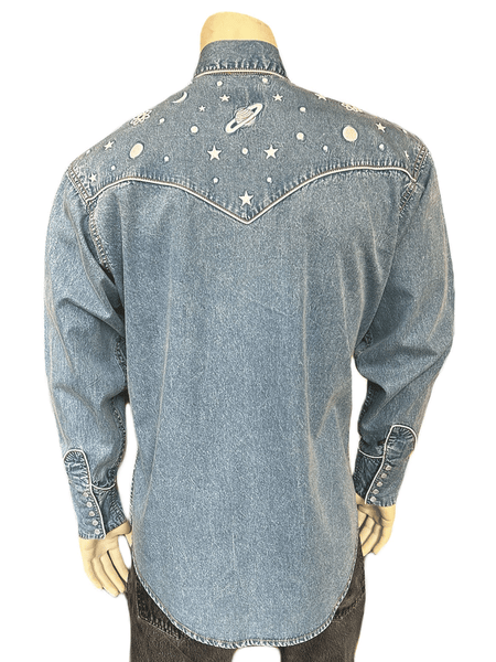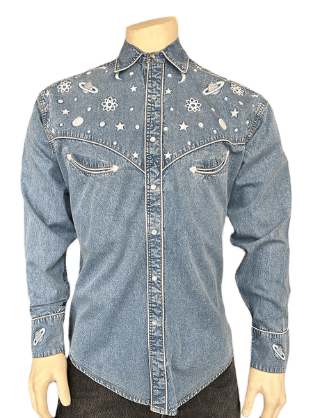 Rockmount 6814-DEN Mens Out of This World Embroidered Denim Western Shirt Light Blue