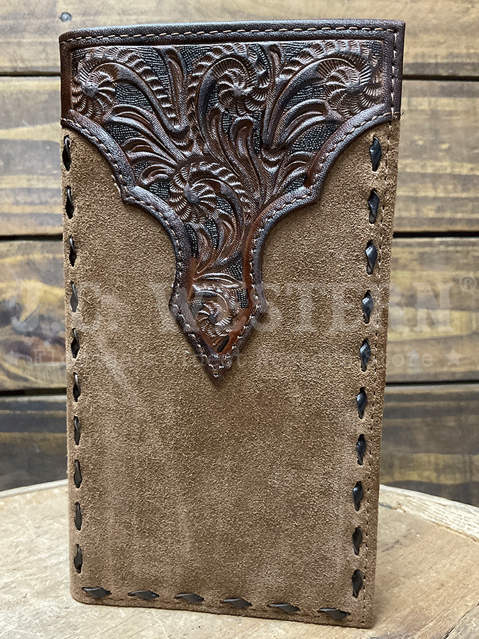 Nocona N500044008 Mens Roughout Buck Lacing Rodeo Wallet Tan Bark - This Nocona rodeo wallet by M&F Western Products is genuine leather. Roughout body with a floral embossed overlay. Brown buck lace stitching around the edges. Multiple card slots, cash slot and ID window on the inside.