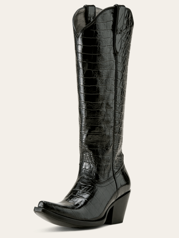 Ariat 10063992 Womens Casanova Western Boot Luxe Caviar Croc Print Black - Gorgeous stitching, premium leather, and the knee height make our best-selling Casanova boot a showstopper wherever it goes. With the comfort you need for long nights boogying at country concerts and twirling on the dance floor, it'll turn heads whether you've paired it with cutoffs or your favorite summer dress.