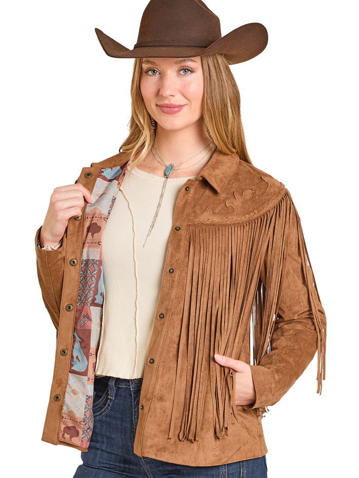 Panhandle DW92C06875 Womens Western Fringe Suede Jacket Copper Brown - Make a statement in this Western Fringe Jacket. Designed with a soft suede-like finish, bold fringe detailing, and snap-front closure, it’s the perfect mix of classic cowboy spirit and modern edge. A patterned lining adds a unique touch, making this jacket as fun on the inside as it is on the outside. Pair it with your favorite denim for an effortlessly cool look.