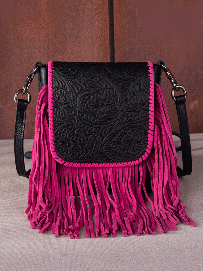 Montana West RLC-L159BK-HPK Womens Genuine Leather Tooled Collection Fringe Crossbody Black Hot Pink