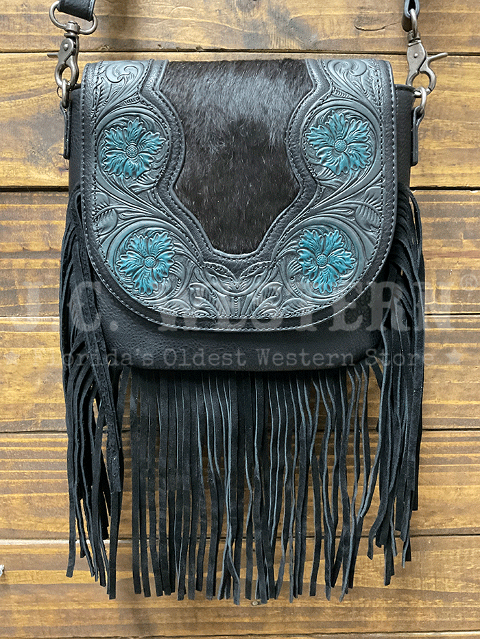 Trinity Ranch TR187-8360BK Womens Genuine Hair On Cowhide Tooled Fringe Crossbody Bag Black